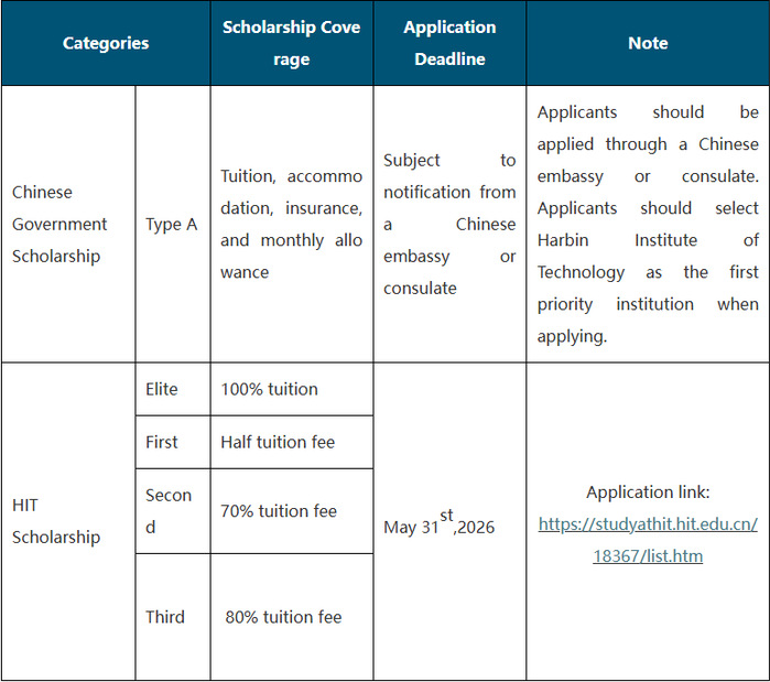 Note: Applicants are not allowed to apply for two types of scholarships (including CSC scholarship and HIT scholarship) simultaneously, once discovered, the admission shall be rejected.